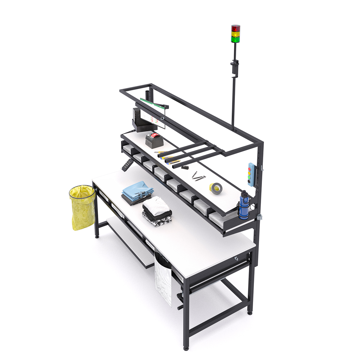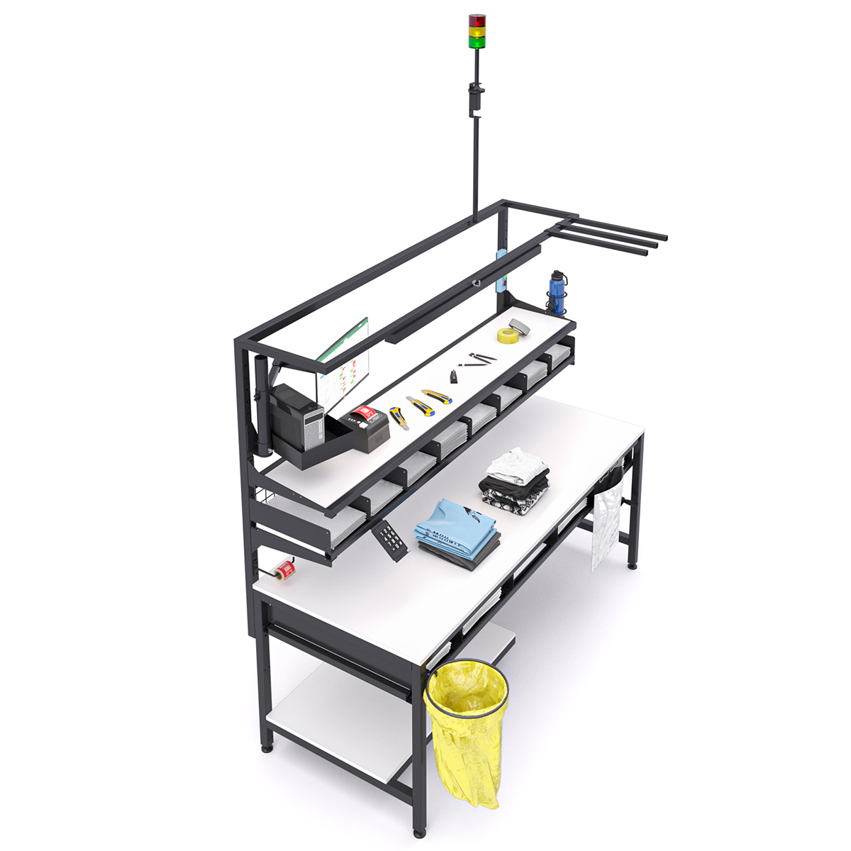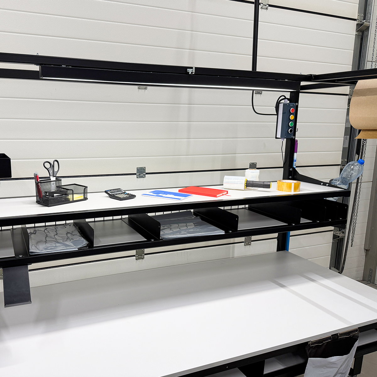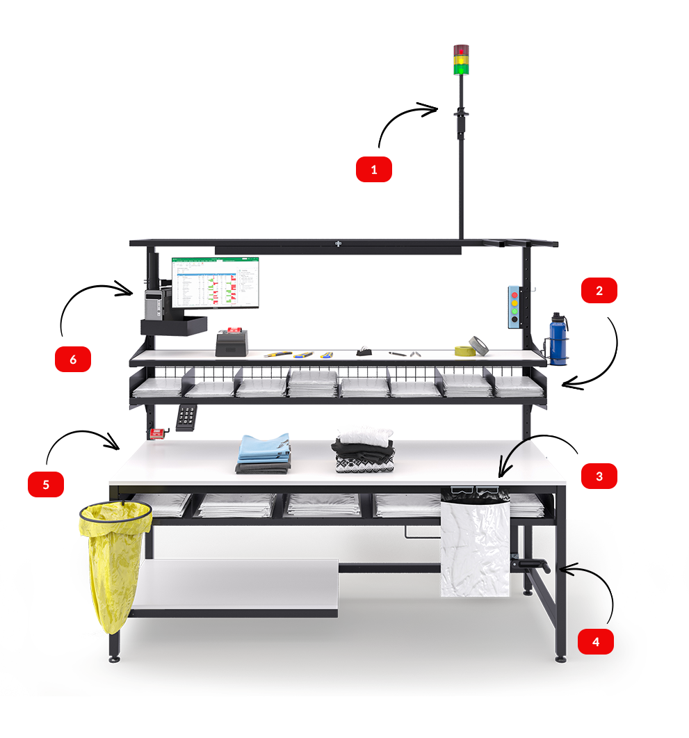 Do sprawnej obsługi zwrotów potrzebne było wyznaczenie miejsca pod komputer z ekranem, klawiaturę numpad i etykiety. Zaprojektowaliśmy je na systemie specjalnych uchwytów, które nie zajmują blatu roboczego. Dodaliśmy też wieżę sygnalizacyjną, która pozwala na wezwanie supervisora jednym przyciskiem.