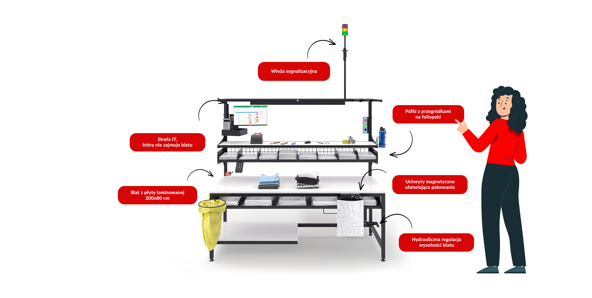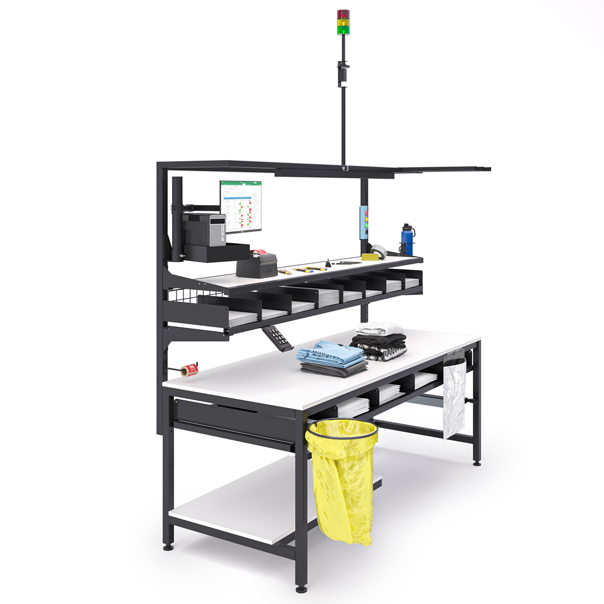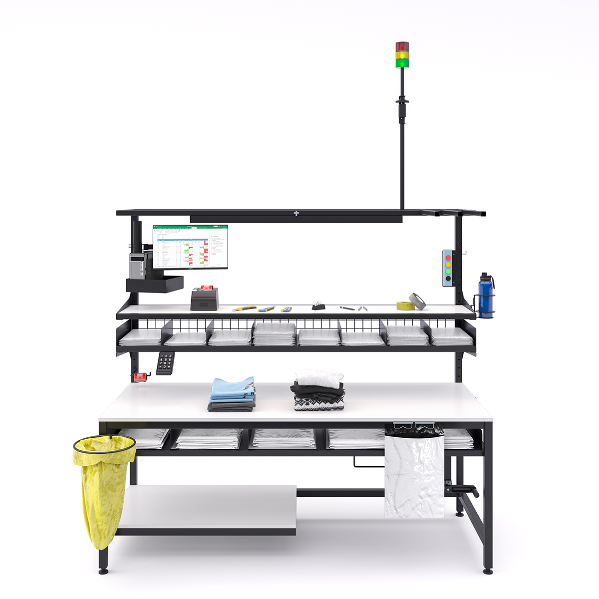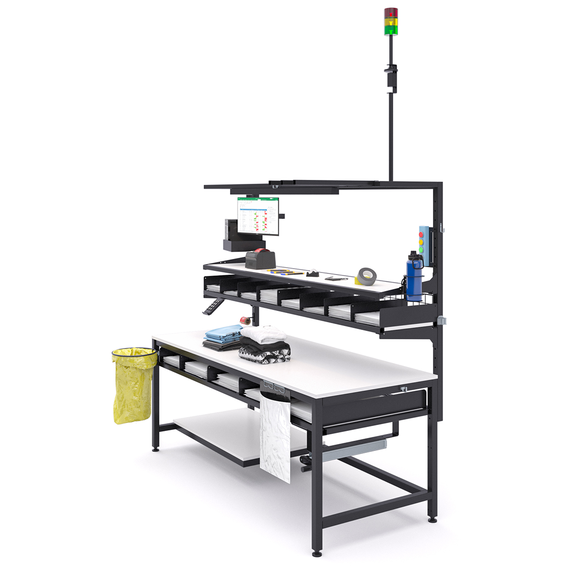 Do sprawnej obsługi zwrotów potrzebne było wyznaczenie miejsca pod komputer z ekranem, klawiaturę numpad i etykiety. Zaprojektowaliśmy je na systemie specjalnych uchwytów, które nie zajmują blatu roboczego. Dodaliśmy też wieżę sygnalizacyjną, która pozwala na wezwanie supervisora jednym przyciskiem.